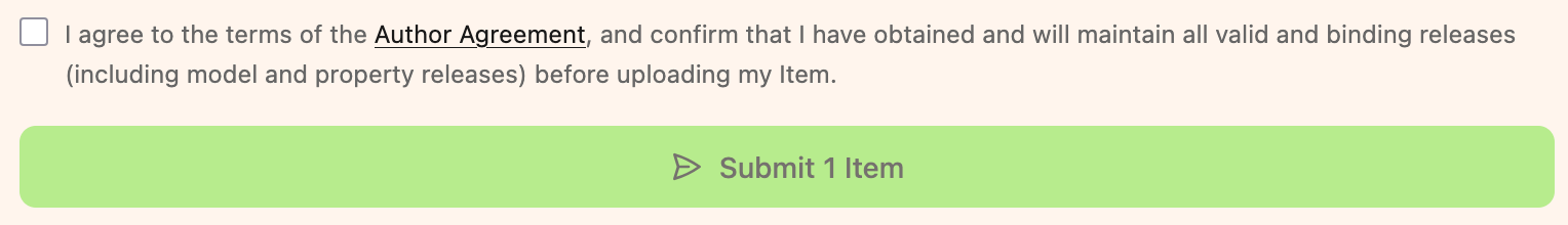 - Tick the box to agree to the terms of the Author Agreement and to confirm that you have obtained and will maintain all valid and binding releases before upload.